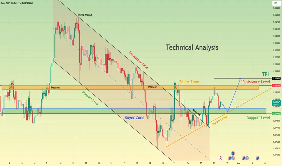 Here’s my technical outlook on EURUSD (2H) based on the current chart structure. EURUSD previously traded inside a well-defined descending channel, where price consistently respected dynamic resistance while forming a sequence of lower highs and lower lows. This structure reflected sustained bearish control and persistent selling pressure as the market gradually declined toward the lower boundary of the channel. The downward move eventually slowed after price reached the Buyer Zone, where demand stepped in and prevented further downside expansion. Following this reaction, EURUSD entered a transitional phase where buyers began to defend the horizontal support band around the 1.1790 region. The repeated respect of this level suggests that liquidity is being absorbed at lower prices, while the market attempts to stabilize after the prior impulsive decline. At the same time, price remains below the major resistance band near 1.1830, which now acts as a Seller Zone after the earlier breakout and subsequent retest. Currently, EURUSD is trading between the Buyer Zone and the Seller Zone, creating a clear decision range for the next directional move. As long as price holds above the 1.1790 support region and respects the ascending trend line, the structure favors a gradual bullish recovery toward the 1.1840 resistance level (TP1), where supply previously entered the market. However, if price loses the Buyer Zone and breaks below the support band, this would weaken the recovery scenario and signal a potential continuation of the broader bearish structure. Such a breakdown could shift momentum back to sellers and open the path for further downside expansion. Until confirmation of weakness appears, the current structure suggests cautious bullish potential supported by local demand and improving short-term momentum