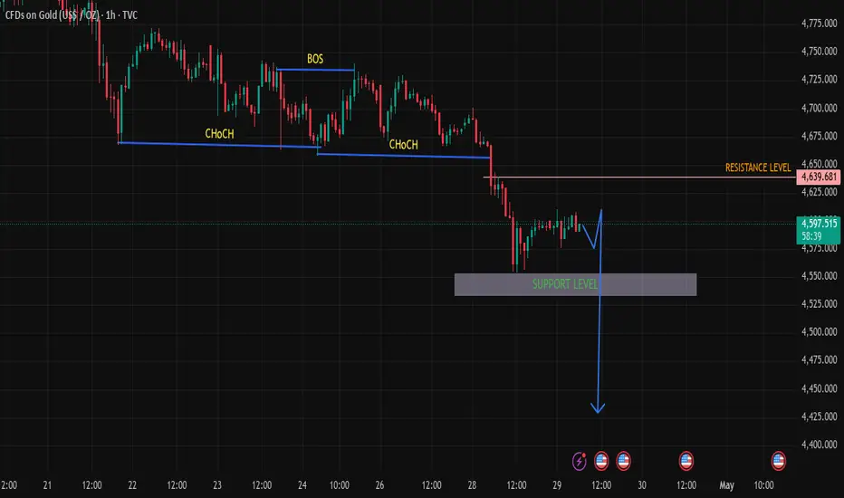 Gold is currently trading around the 4600 region, hovering near support as bearish pressure continues to build.