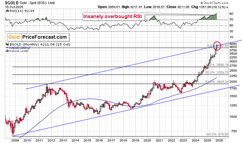 Remember – we saw a similar rally in 2011, and back then, silver erased two months of gains in one week. If so, even if gold and silver are still rallying today, given gold’s long-term situation, it looks ready to top and slide any day now. Even if it doesn’t top this week, it seems extremely likely to me that we’ll have the 2025 top later this month.