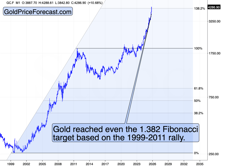 On the above chart, we see that gold moved to – and even a bit above – its 1.382 Fibonacci extension based on the 1999 – 2011 bull market.