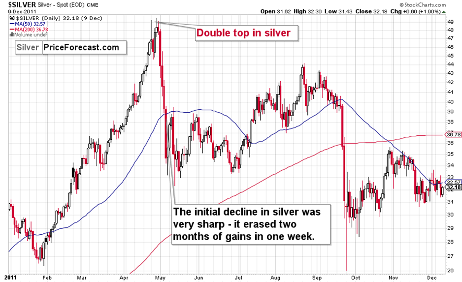 But, given this kind of volatility, getting out a few days ahead or even a week ahead of the top doesn’t change that much, as the same – or (more likely) even bigger – volatility will be seen on the downside, and the rally that we see right now will be erased very quickly. Remember what happened in silver in 2011 – two months of gains were erased in just a week.
