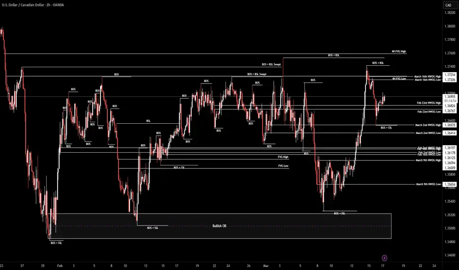 By examining the 2H Chart of USDCAD we can see that with the bullish run, it reached the high of 1.3741, going inside the 4H FVG and going above the C.E., but it failed to hold above and started to drop, going as low as 1.3653, reaching the March 2nd NWOG High and then bounced back up, currently being traded at 1.3695, above the Feb 23rd NWOG.